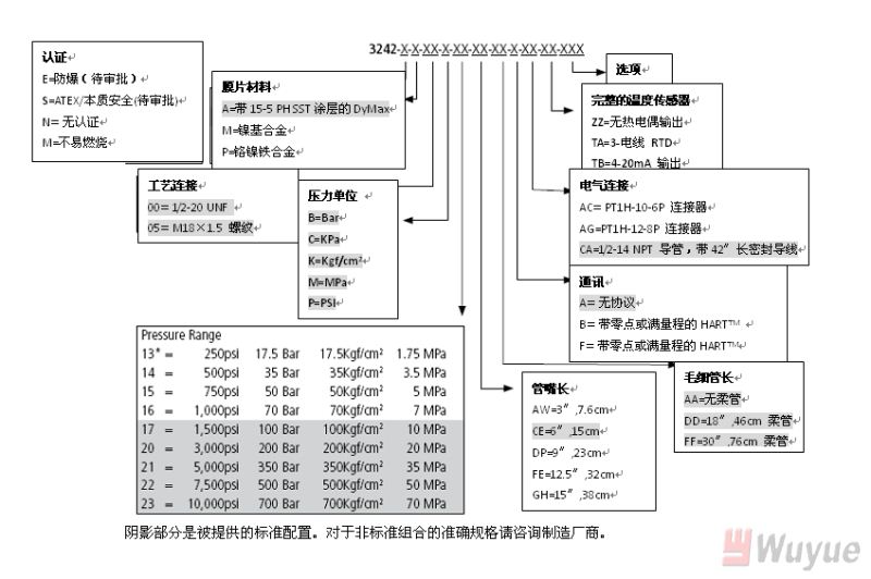 輸出,模擬:4-20mA(標(biāo)準(zhǔn)壓力,溫度可選) 輸出,數(shù)字:HART 綜合精度(錯誤)(20-100%滿量程): ±0.25%滿量程(3M和3M以上) ±0.35%滿量程(1.5M和1.5以下) 溫度漂移(77-572℉,25-300℃): 0.001%滿量程/℉,最大(0.001%滿量程/℃,最大) 重復(fù)性:±0.1%滿量程 爆破額定壓力:2X滿量程 超壓 額定:1.5X滿量程 量程:1,500至10,000psi 可調(diào)范圍:6:1調(diào)節(jié)比,向下 負(fù)載電阻:250歐姆@18Vdc;500歐姆@23Vdc |
